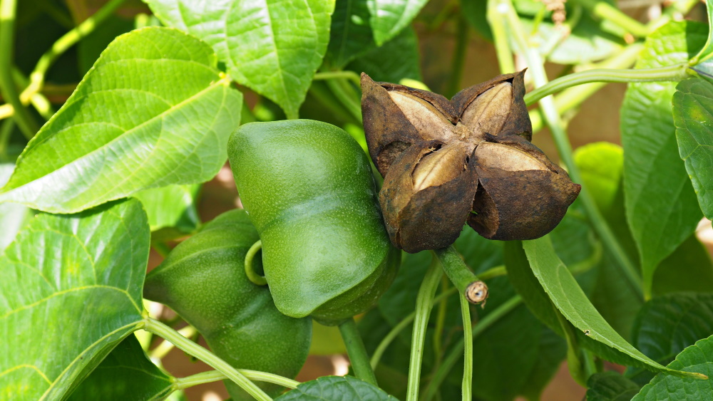 Plody Sacha Inchi majú tvar hviezdy, sú jasne zelenej farby. Počas dozrievania hnednú a vo vnútri sú uložené semená (oriešky), oddelené od seba prepážkami.